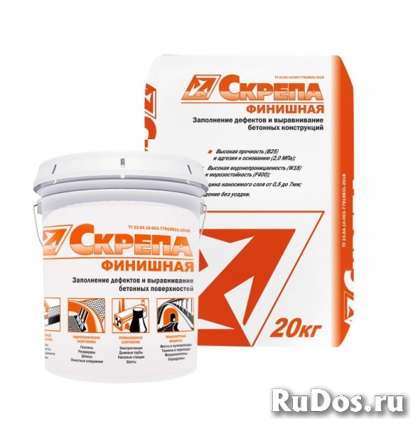 Смесь сухая мелкозернистая, ремонтная, поверхностно-восстановительная Пк1, B25, W18, F400 "Скрепа Финишная" ГОСТ 31357-2007. Состоит из портландцемента, тонкого кварцевого песка, химических добавок и армирующего фиброволокна.