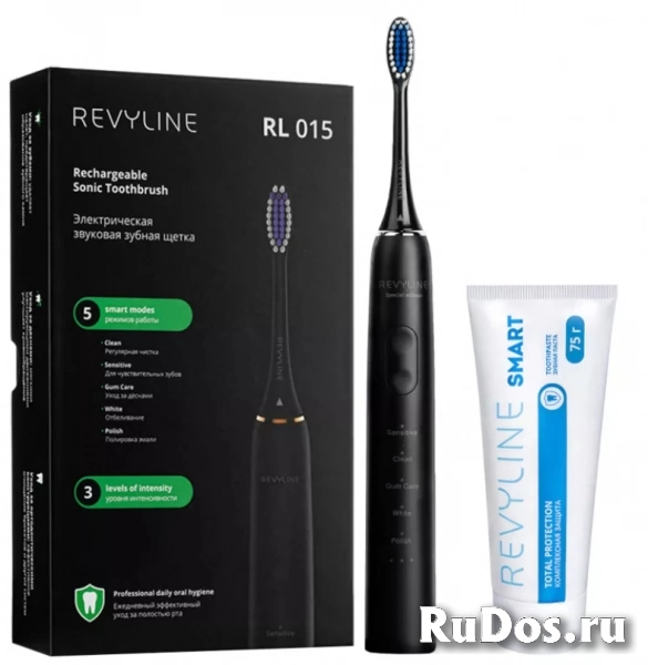 Новейшая звуковая щетка Revyline RL 015 в черном дизайне для качественной чистки зубов. В устройстве 5 режимов с 3 уровнями мощности, 3 насадки и стильный чехол в подарок. Щетку можно использовать для всей семьи и брать в поездки.
