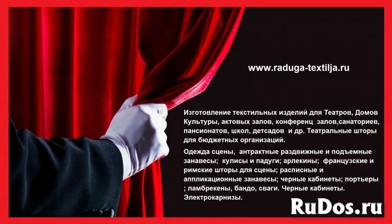 Изготовление текстильных изделий для Театров, Домов Культуры, актовых залов, конференц залов, санаториев, пансионатов, школ, детсадов и др. Театральные шторы для бюджетных организаций. Предоставляем услуги по пошиву одежды для сцены, изготовлению занавесов, арлекинов, кулис и сценических задников.