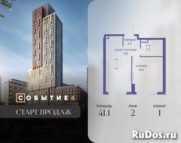 Продаётся 1-комнатная квартира от застройщика: общая площадь 41.10 м, жилая 14.60 м, кухня 19.50 м, 2-й этаж, жилой квартал «Событие-6», корпус 2 (секция 5) Срок сдачи: 1 квартал 2029 года.
