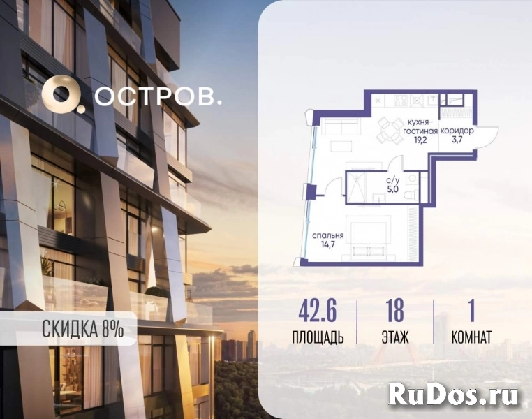 Продаётся 1-комн. квартира от застройщика: общая площадь 42.60 м, жилая 14.70 м, кухня 19.20 м, 18-й этаж, жилой квартал «Остров 12», корпус 3 (секция 1) . Срок сдачи: 1 квартал 2029 года.