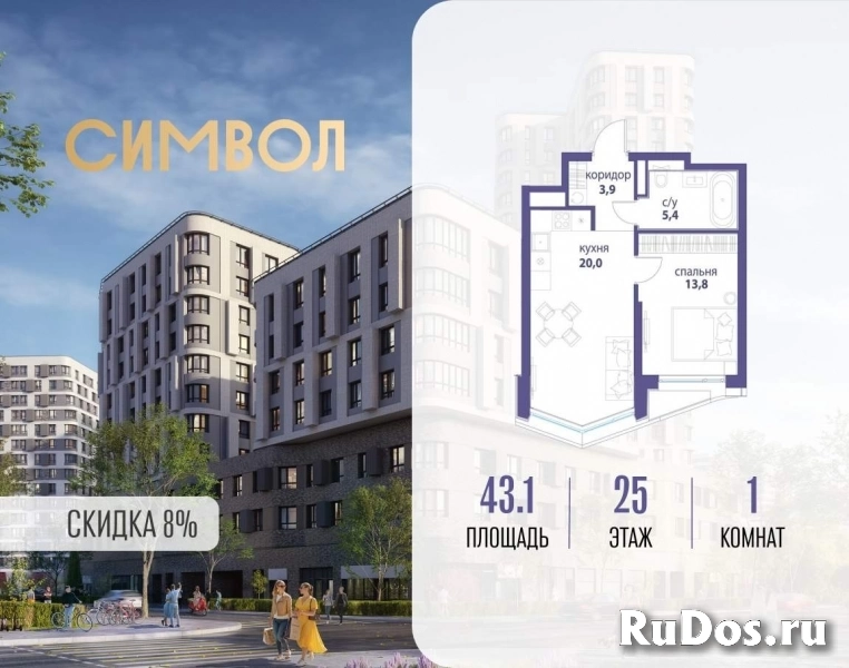 Продается 1-комнатная квартира от застройщика: общая площадь 43.10 м, жилая 13.80 м, кухня 20.00 м, 25-й этаж, жилой квартал «Вдохновение», корпус 33 (секция 2) . Срок сдачи: 4 квартал 2027 года.