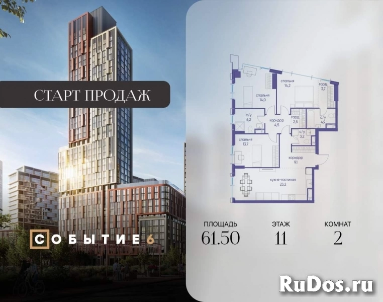 Продаётся 2-комнатная квартира от застройщика: общая площадь 61.50 м, жилая 32.00 м, кухня 17.80 м, 11-й этаж, жилой квартал «Событие-6», корпус 2 (секция 5) Срок сдачи: 1 квартал 2029 года.