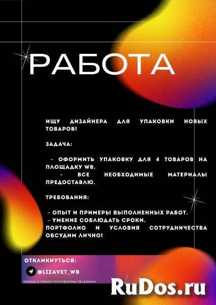 Задача: упаковать 4 товара для WB, материалы для работы есть. Требования к исполнителю: наличие примеров работ, соблюдение сроков выполнения. Портфолио и условия работы - готова обсудить лично!