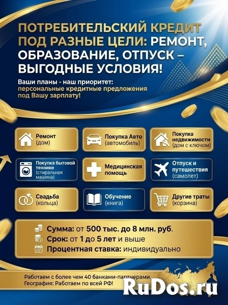 Потребительский кредит для физических лиц по РФ! Деньги под разные цели!