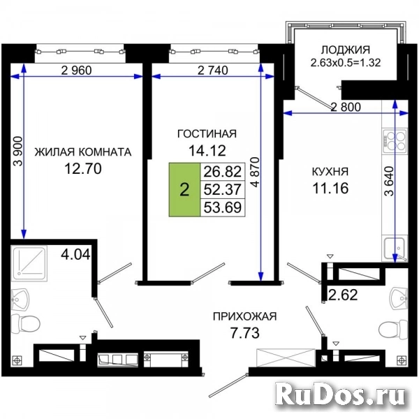 - Количество комнат: Двухкомнатная